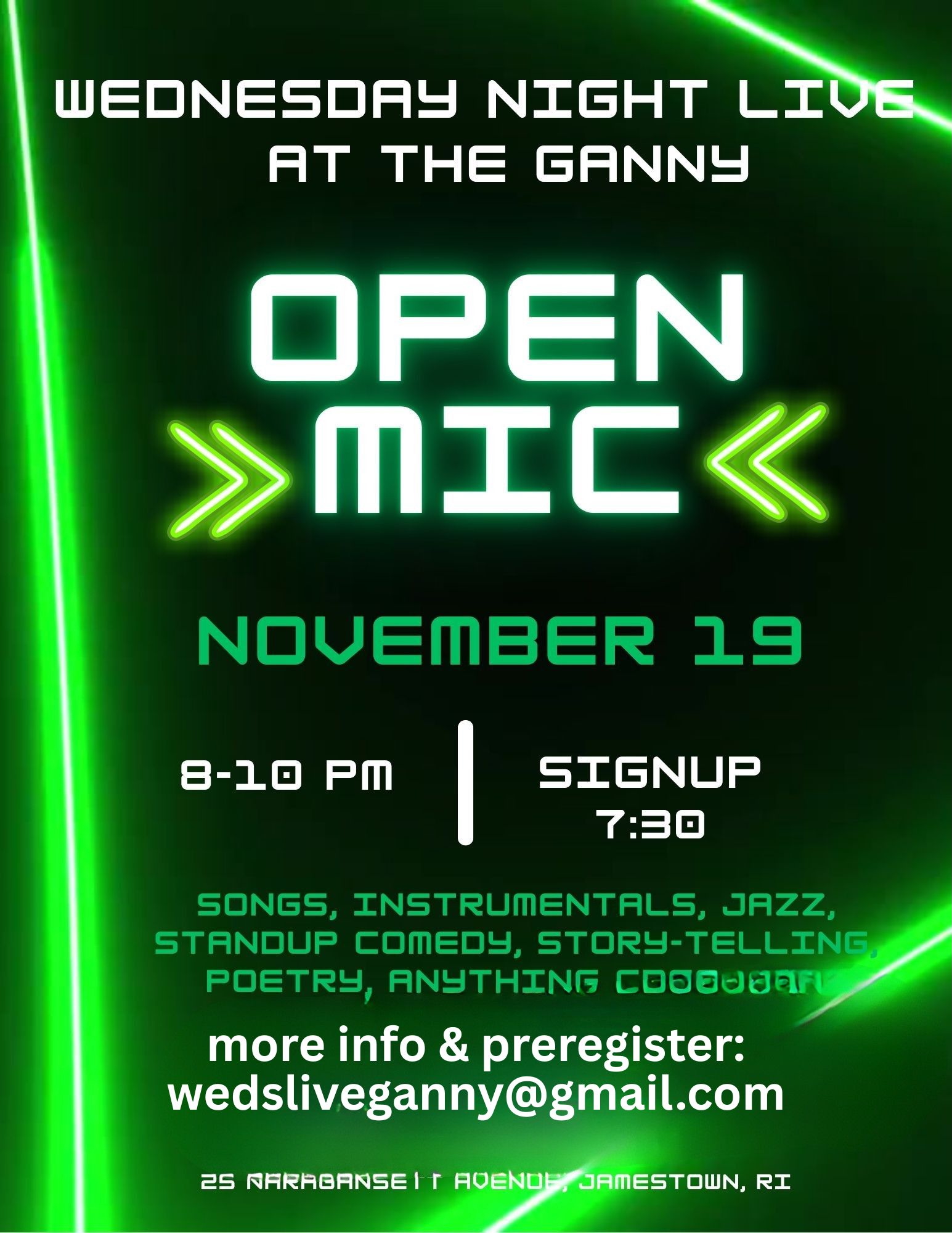 Wednesday Night Live at the Ganny - Open Mic November 19, 2025 8-10 PM Signup 7:30 25 Narragansett Ave, Jamestown For more info & to preregister: wedsliveganny@gmail.com